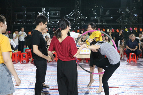 第二個(gè)游戲是團(tuán)圓點(diǎn)燈籠。6人手拉手圍成一圈,把呼啦圈套過(guò)身體依次傳遞下去,過(guò)程中不可以松手。最后一名隊(duì)員完成傳遞后,立馬走到指定位置挑起燈籠說(shuō)出“中秋快樂(lè)”,用時(shí)少的即為勝利。該游戲講究隊(duì)員間的配合度和穩(wěn)定性,這個(gè)游戲結(jié)束三隊(duì)分差稍微拉開(kāi)了。